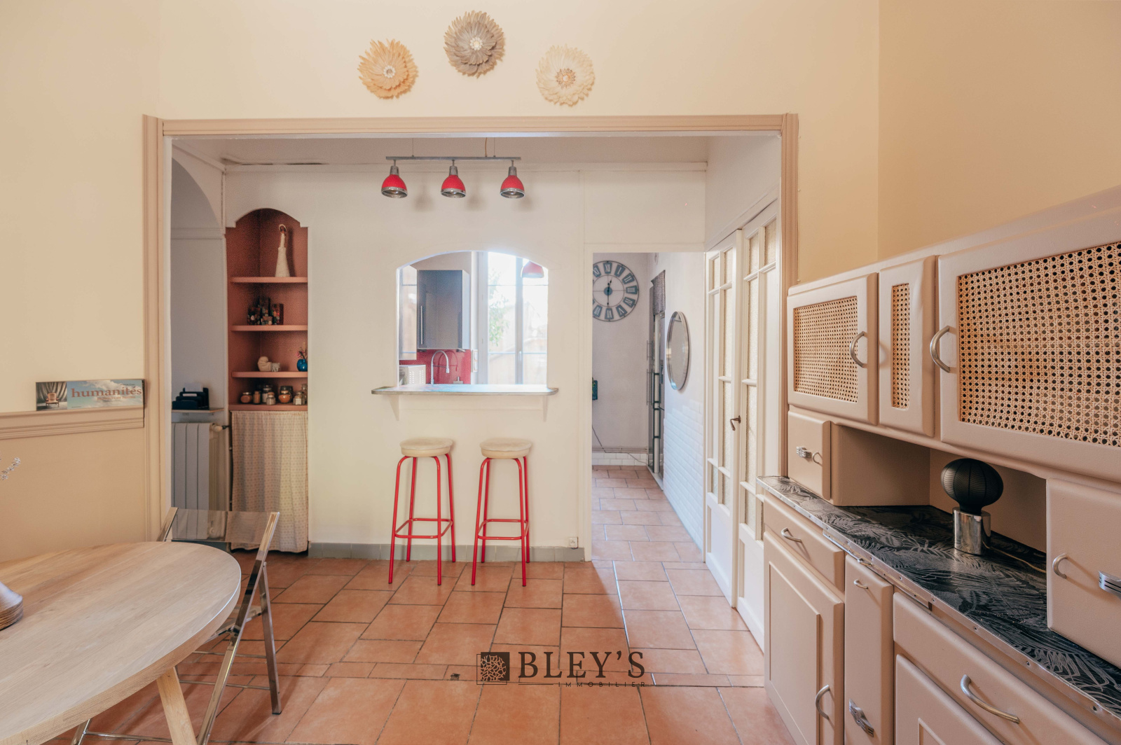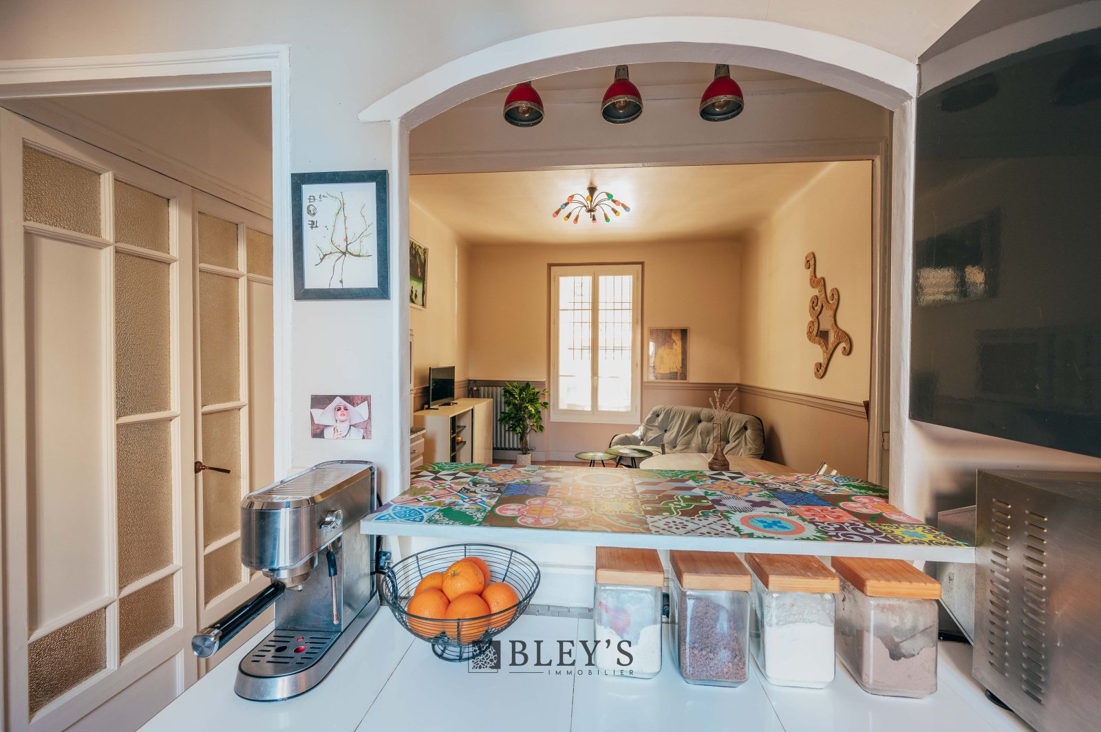 L'appartement, traversant, se situe au rez-de-chaussée d'un immeuble typique marseillais sécurisé, très bien entretenu préservant son caché.